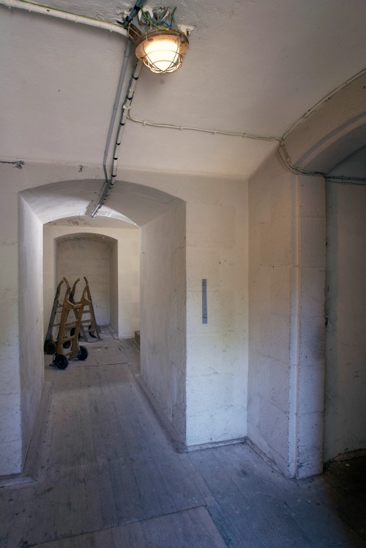 Vue intérieure de la poudrière n° 2 (P2) de la vallée de Kerhuon : sas d'entrée (état en 2009). Il a conservé son plancher d'origine. Au fond, trois diables en bois pour la manutentionImmatriculation
