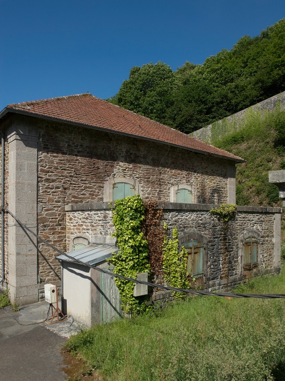 Vue de détail de la poudrière n° 1 (P1) de la vallée de Kerhuon : pignon nord-est avec son sas d'entrée (état en 2009). Le magasin est couvert en tuile plate ; les chaînages d'angle sont en pierre de taille de granite grisImmatriculation