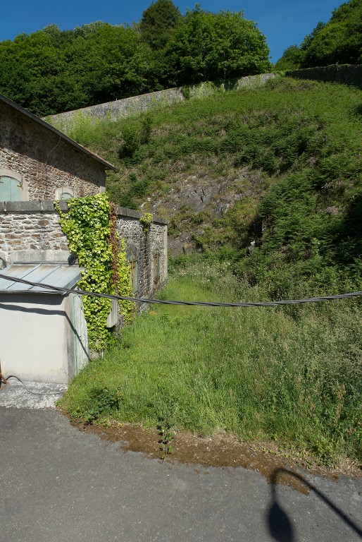 Vue de la poudrière n° 1 (P1) de la vallée de Kerhuon : mur suivant le relief et délimitant l'enceinte de sûreté (état en 2009)Immatriculation