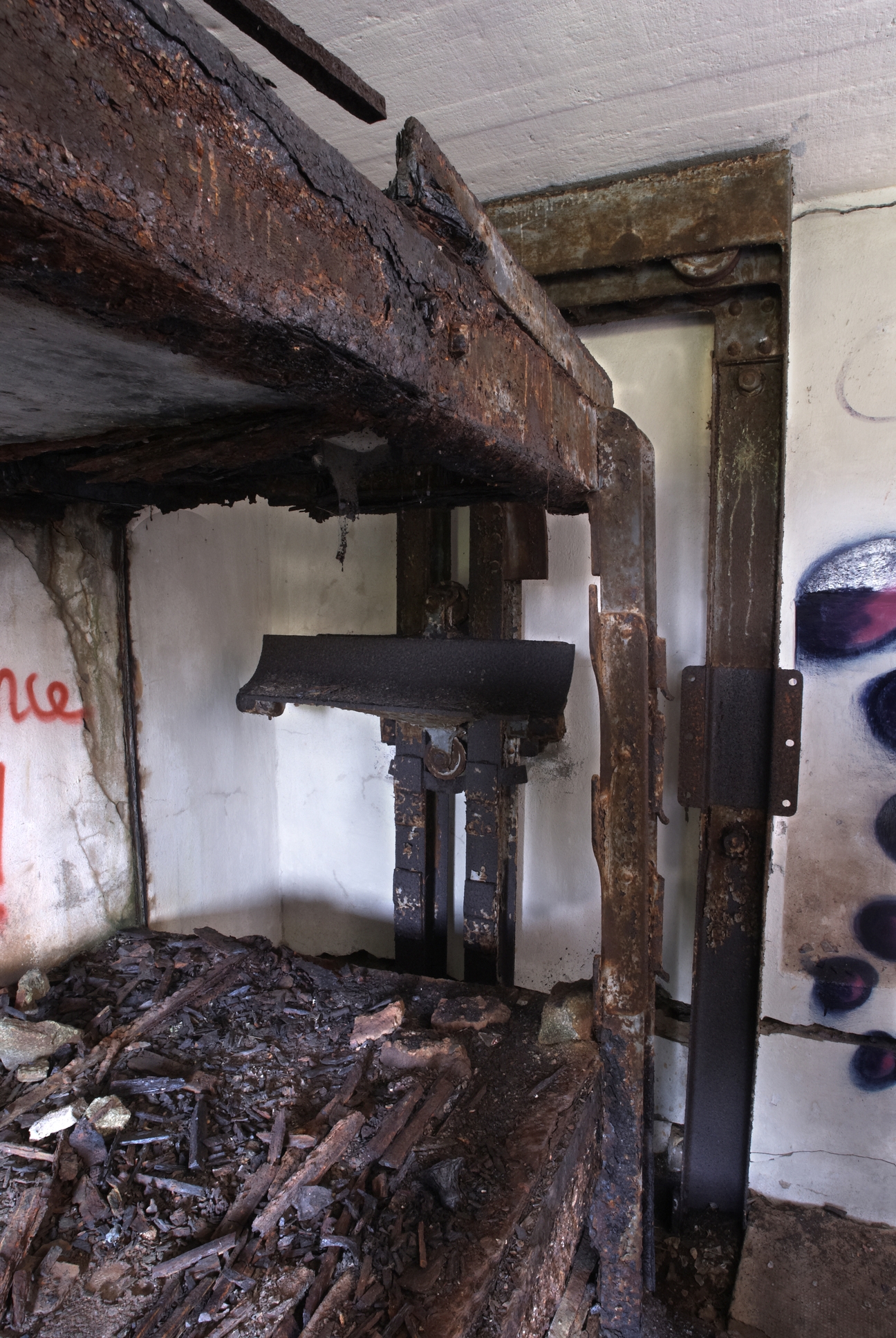 Vue intérieure de l'un des magasins de combat : étagère et monte-obus dans un compartiment à projectiles (état en 2009)Immatriculation