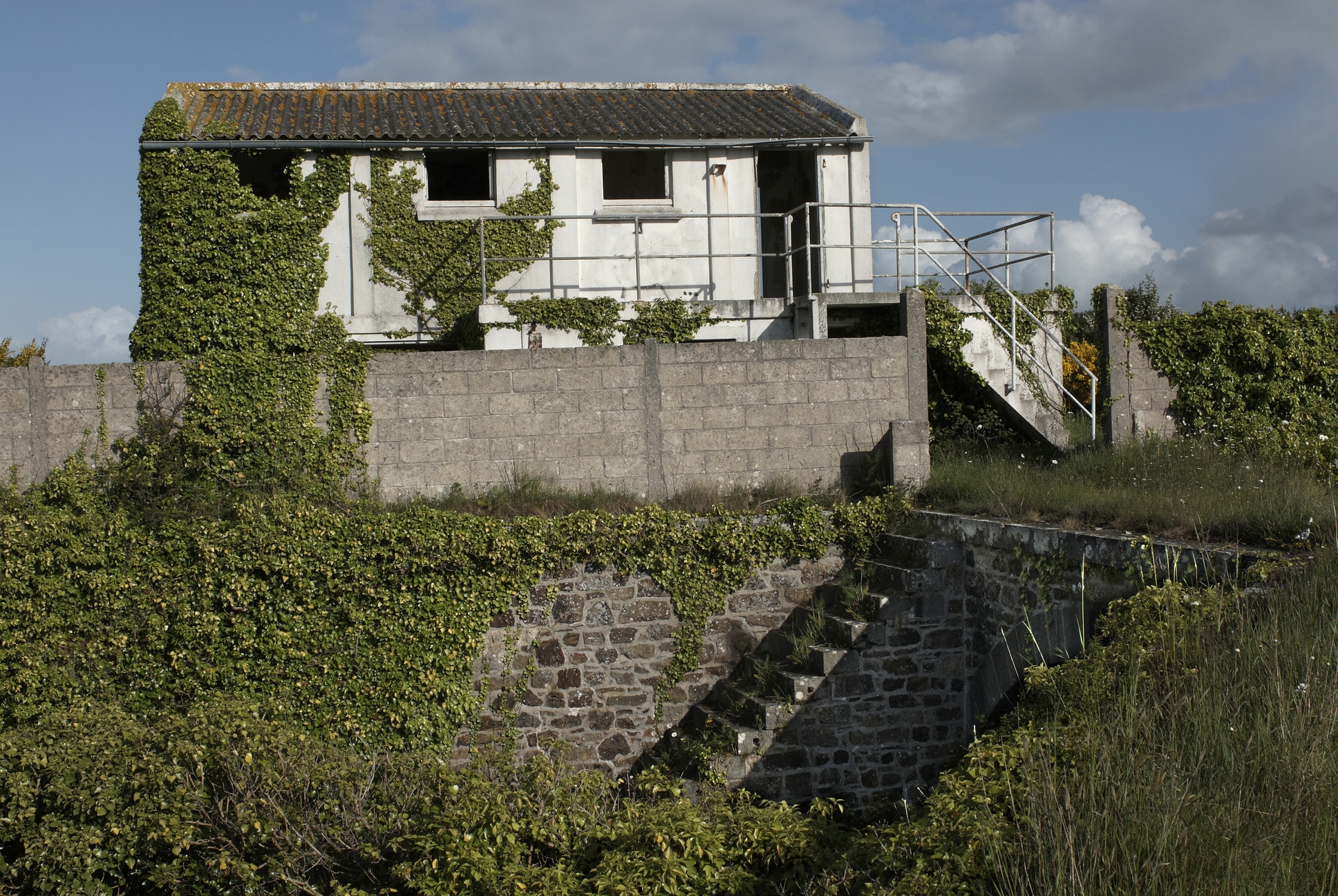 Vue générale des bâtiments implantés dans/sur la redoute (état en 2009). Au point le plus haut, le poste de commandement de groupe de batteries d'artillerie. La végétation a repris possession des lieuxImmatriculation