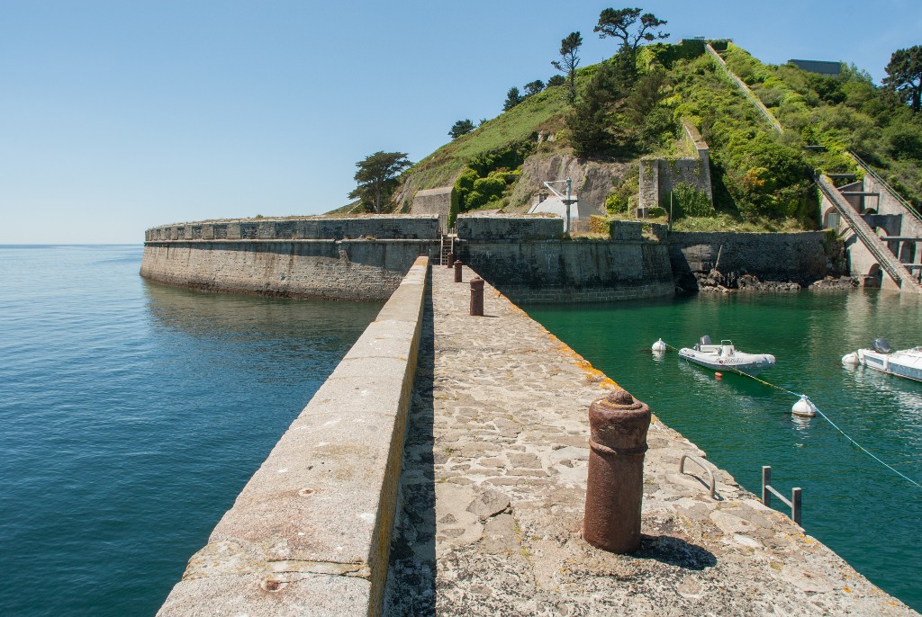 Vue de la batterie basse du Mengant depuis le môle des torpilleurs (état en 2009). Sur le môle est plantée une série de canon bollard. A droite, la rampe-funiculaire du bâtiment dessai de radiodétection établie parallèlement à la branche tombante estImmatriculation