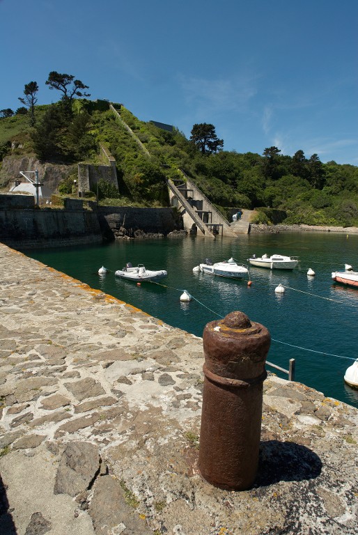 Vue de la rampe-funiculaire du bâtiment dessai de radiodétection depuis le môle des torpilleurs (état en 2009). Au premier plan, un canon bollardImmatriculation
