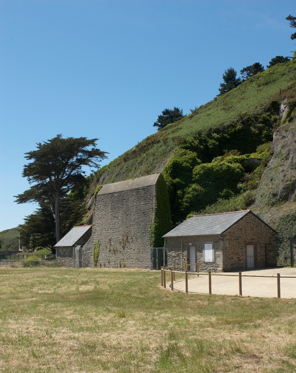 Vue des bâtiments implantés sur la batterie basse du Mengant (état en 2009). Au centre, le mur de protection de l'usine électrique du poste de projecteurImmatriculation