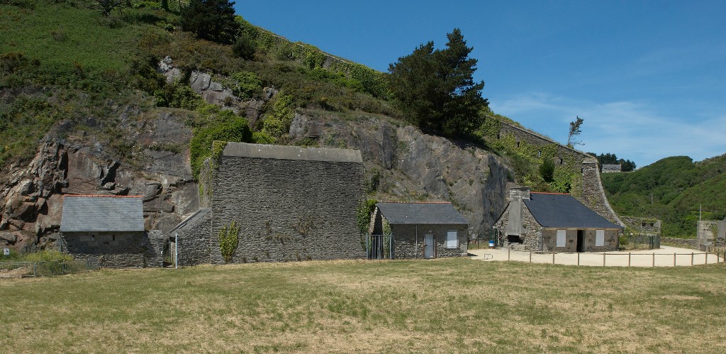 Vue des bâtiments implantés sur la batterie basse du Mengant (état en 2009). Au centre, le mur de protection de l'usine électrique du poste de projecteur. A droite, le corps de gardeImmatriculation