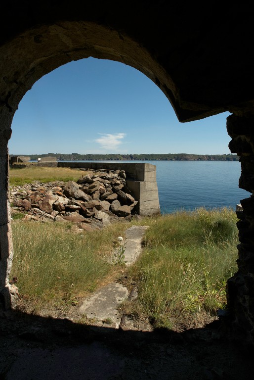 Vue de la batterie basse depuis l'abri de jour du projecteur (état en 2009). Au centre, les vestiges de la voie ferrée du projecteurImmatriculation