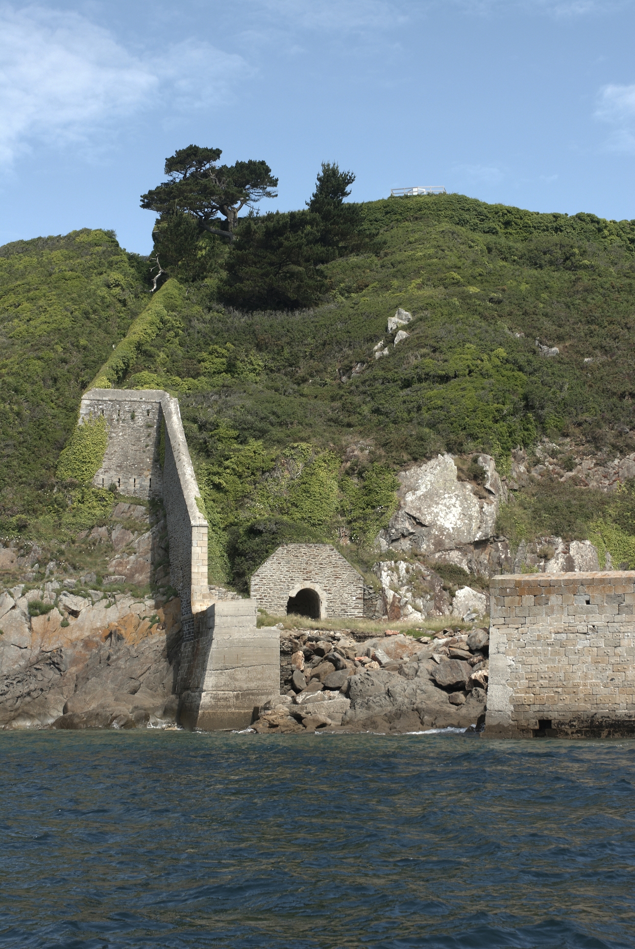 Plouzané : vue du fort du Mengant, mur d'enceinte dit branche tombante ouest percée de créneaux de mousqueterie et escalier parallèle. Abri de jour du projecteurImmatriculation