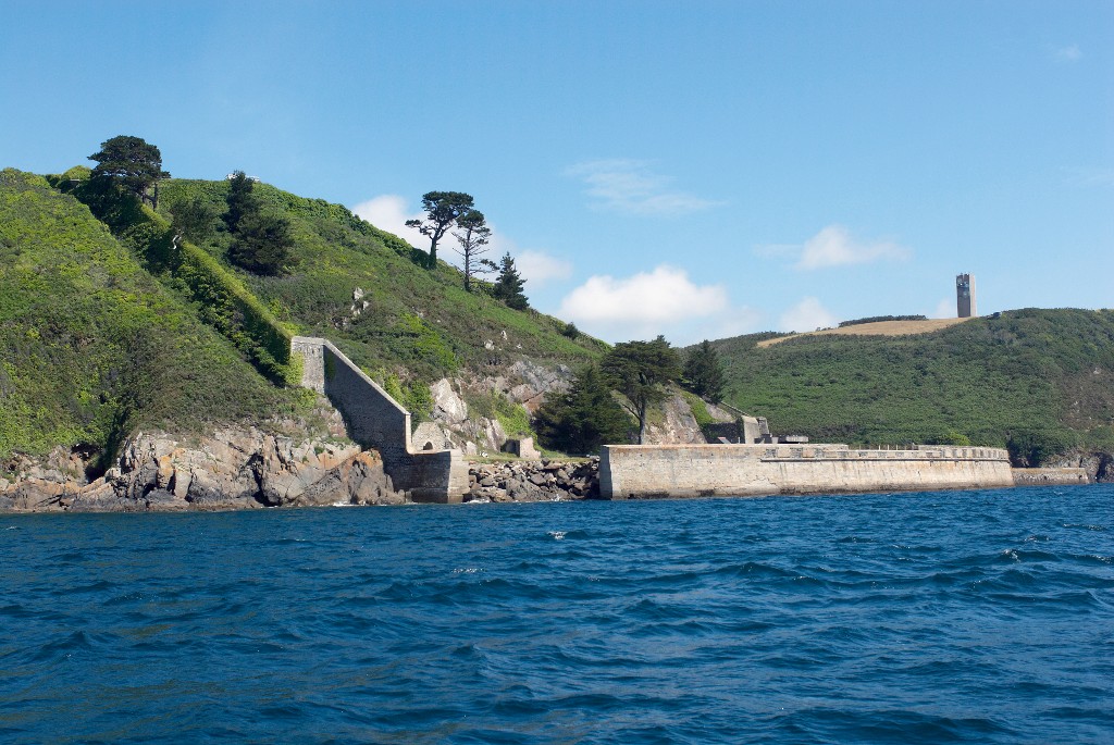 Vue générale depuis la mer (état en 2009). Deux branches tombantes ferment les flancs à lest et à louest. A l'arrière-plan sur la hauteur, la tour de mesures de KerdalaezImmatriculation