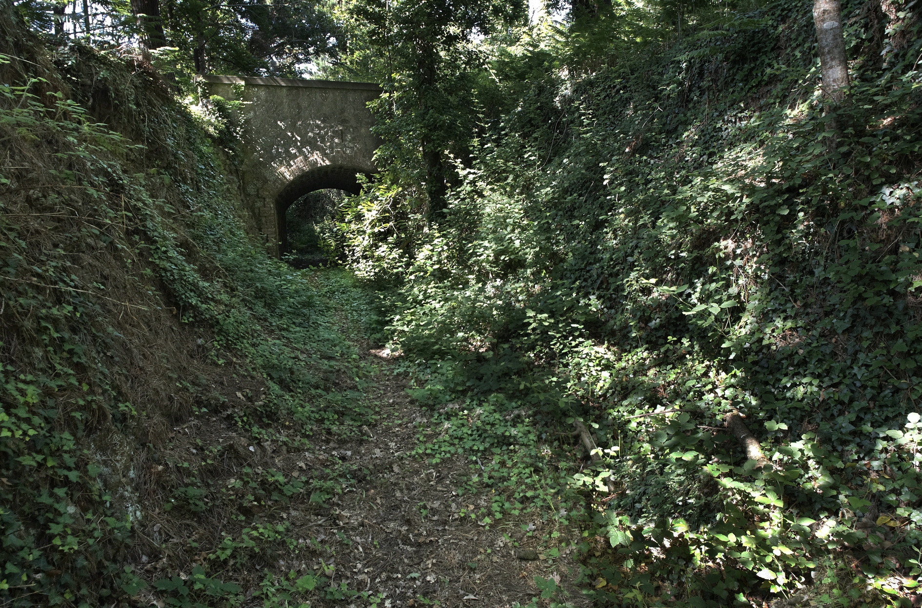 Vue de siutation du pont à une arche. Il permet la communication entre la batterie d'artillerie et le magasin à poudre sous rocImmatriculation