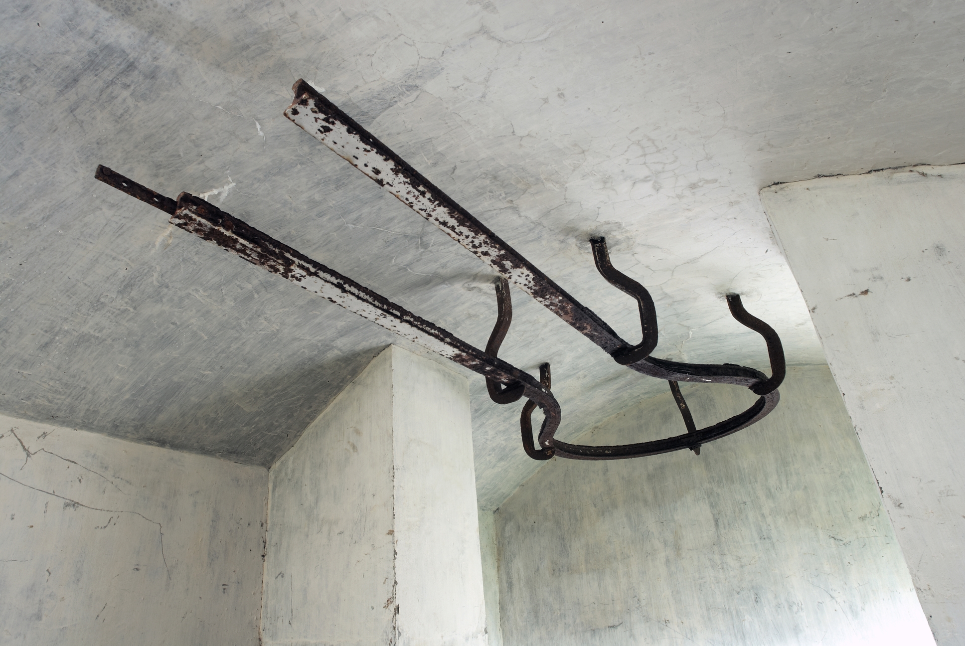 Vue intérieure du magasin à munitions (vers le fond) : fixations et rail pour la manutention des obus via un palan. Les murs, préalablement enduits sont blanchis à la chauxImmatriculation