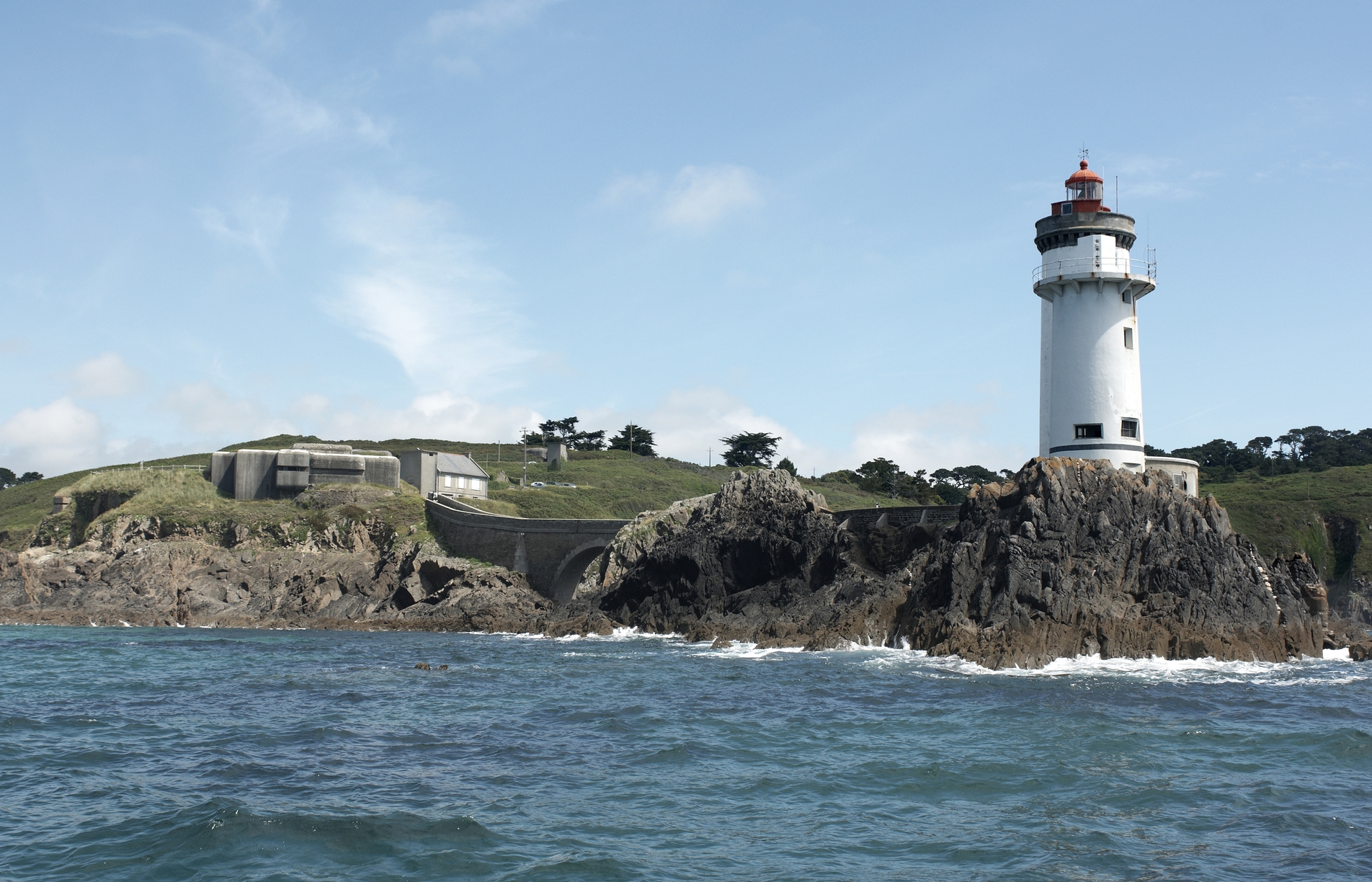 Vue de la pointe du Petit Minou depuis la mer (extrémité sud) : phare du petit Minou et tour pour radôme, pont d'accès, fort et bunker - poste de commandementImmatriculation