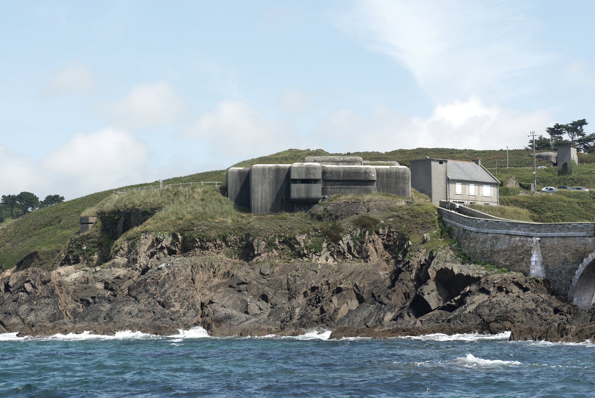 Vue de la pointe du Petit Minou depuis la mer (extrémité sud) : bunker - poste de commandement, logement et transformateur électriqueImmatriculation