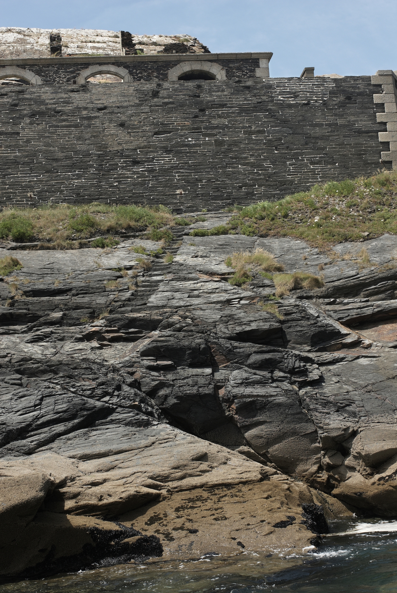 Roscanvel : vue de l'ensemble fortifié de l'îlot des Capucins depuis la mer, escalierImmatriculation