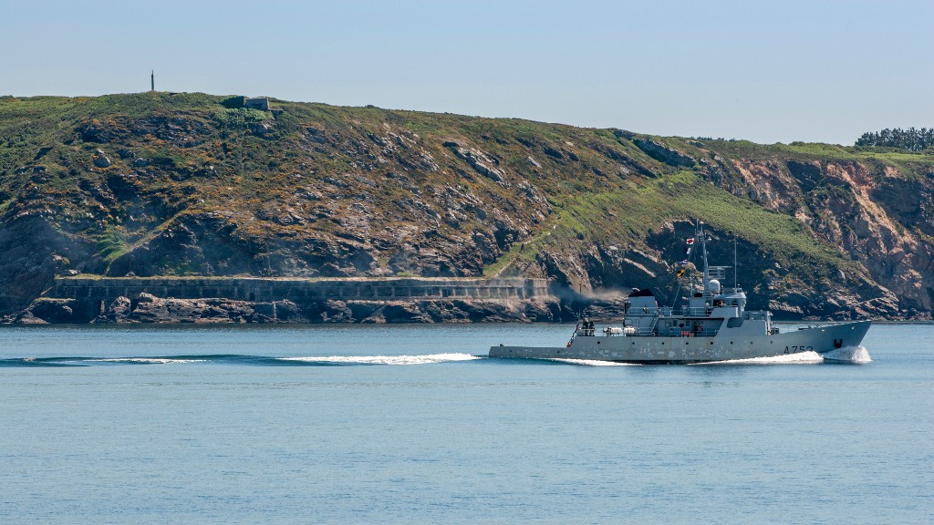 Vue générale de la batterie de Cornouaille depuis le fort du Menagnt (état en 2009). Le bâtiment-école de la classe Léopard baptisé Chacal (A 753) sort de la rade de Brest à vive allureImmatriculation