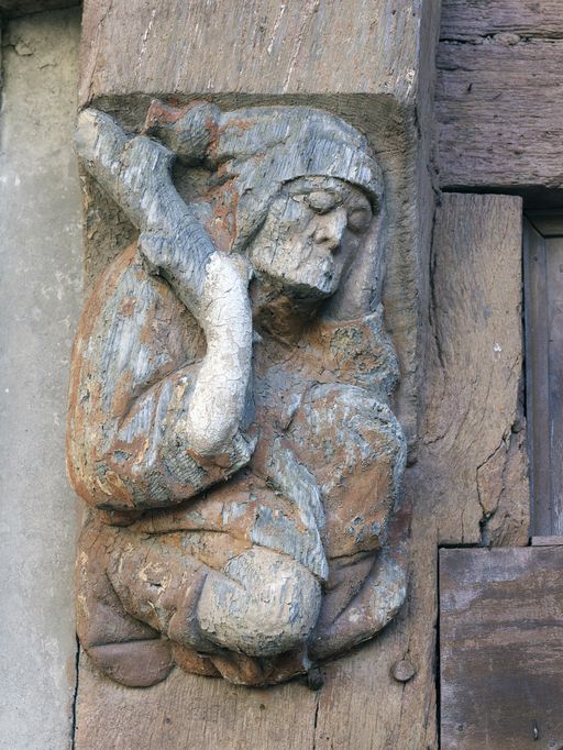 Elévation ouest, rez-de-chaussée, décor de l'aisselier nord : homme endormi au bâton (état en 2012)Immatriculation