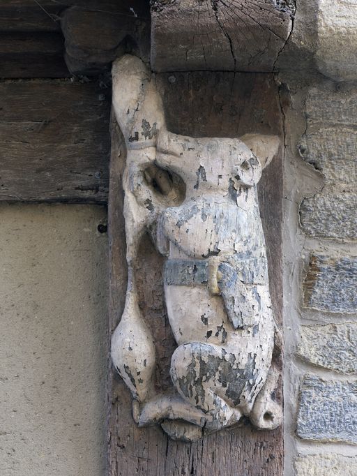 Elévation sud, rez-de-chaussée, décor du poteau d'huisserie : la truie qui file (état en 2012)Immatriculation