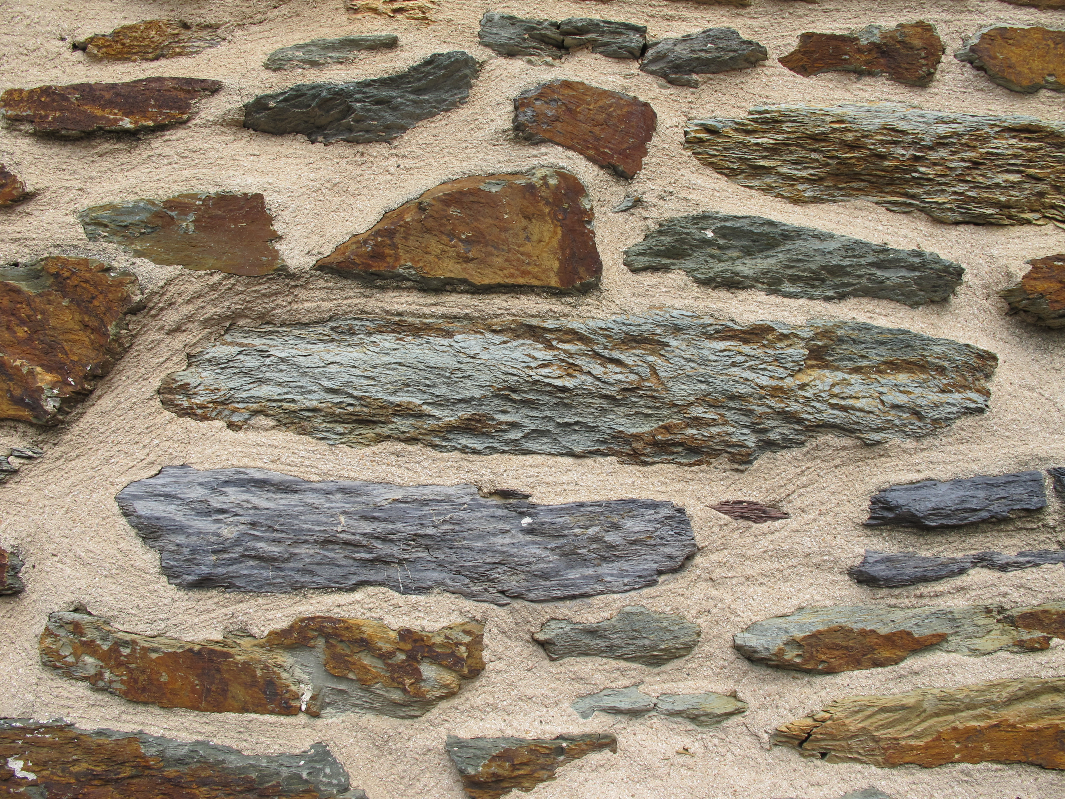 Mur-pignon sud : le matériau de schiste multicolore (état en 2012)Immatriculation