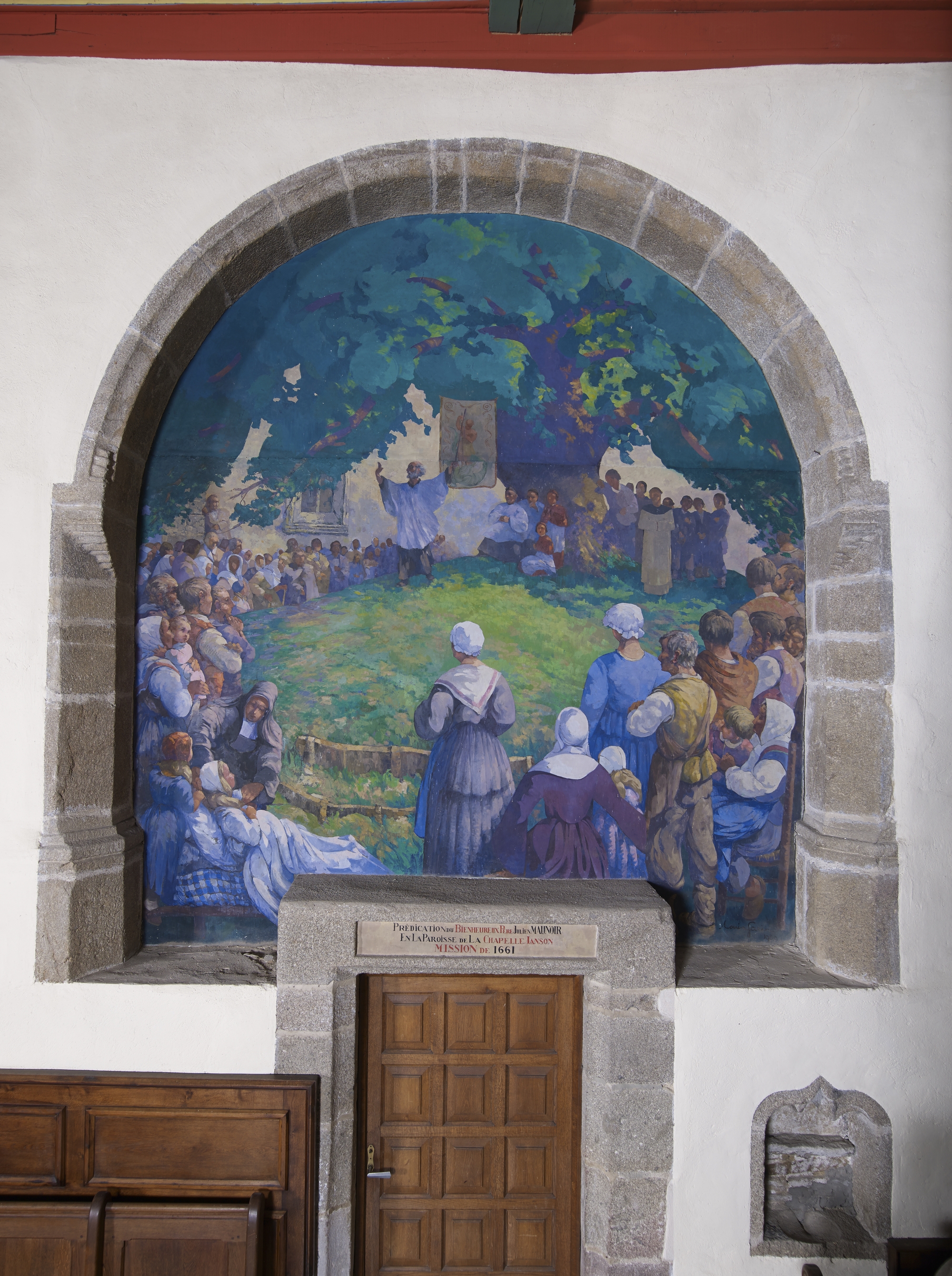 Choeur (mur Nord) : baie de l'ancienne chapelle seigneuriale, aujourd'hui murée et ornée d'une fresque de Louis Garin (1ere moitié du 20e siècle) représentant la prédication du Père Julien Maunoir (mission de 1661)Immatriculation