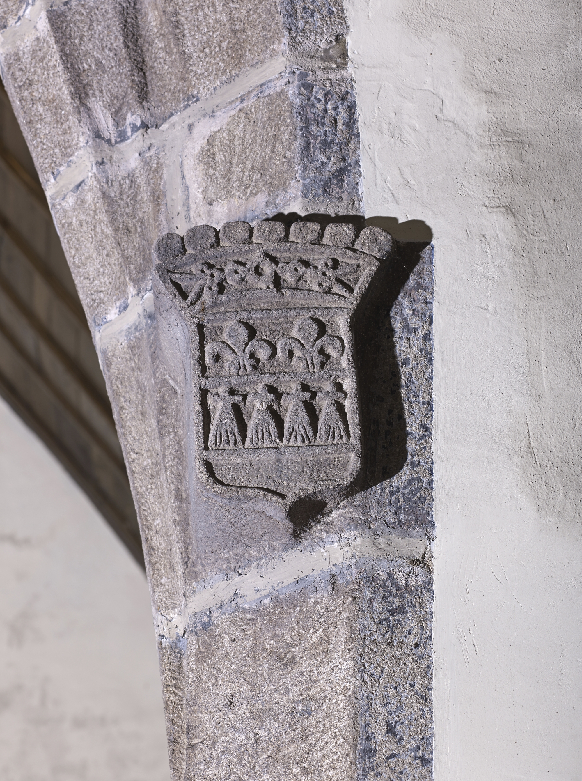 Croisée de transept (chapelle sud) : armoiries d'Eustache de Lys, seigneur de Montfromery ("de gueules à la fasce d'argent chargée de quatre hermines de sable et surmontée de deux fleurs de lys d'argent")