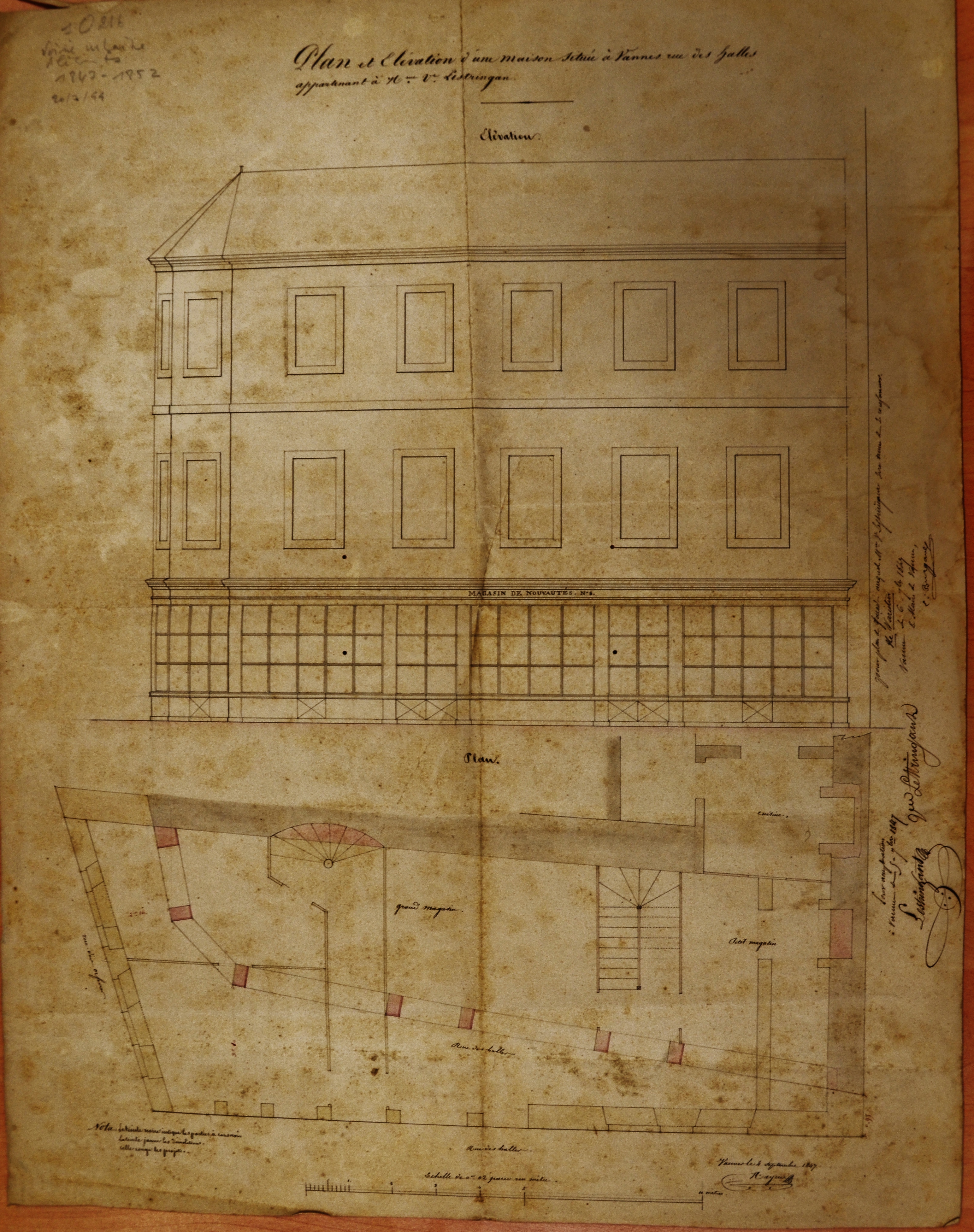 Plan et élévation de la maison Lestringant par Mayeux, 1847. AM Vannes 1O216.Immatriculation