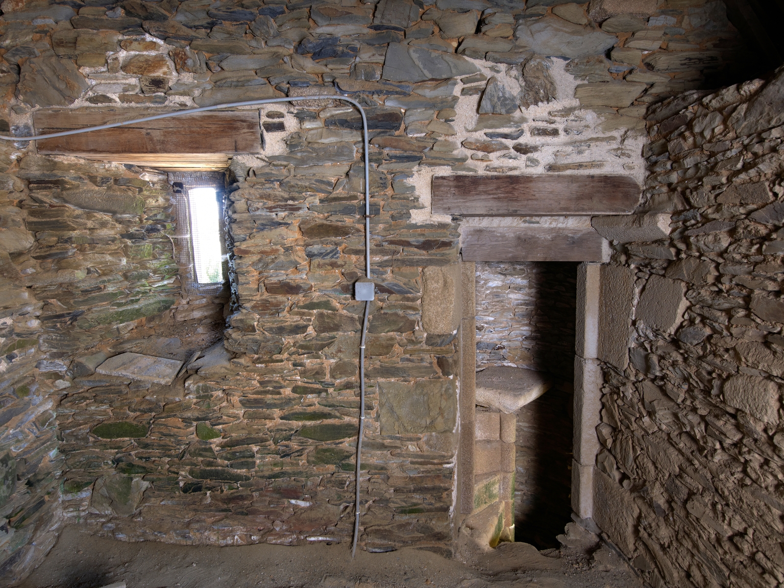 Construction d'angle nord-est. Pièce haute située au nord. Vue intérieure avec desserte de l'escalier en vis et jourImmatriculation