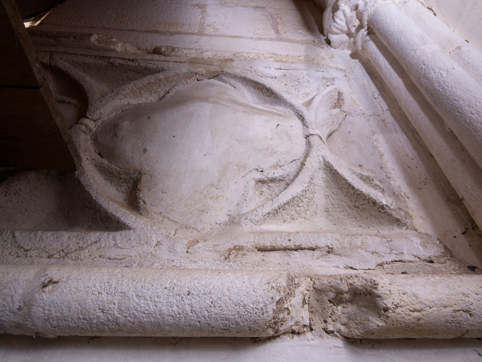 Nef. Ancienne tribune située à l'ouest partiellement dissimulée par le buffet d'orgue. Détail d'un quadrilobe bouchéImmatriculation