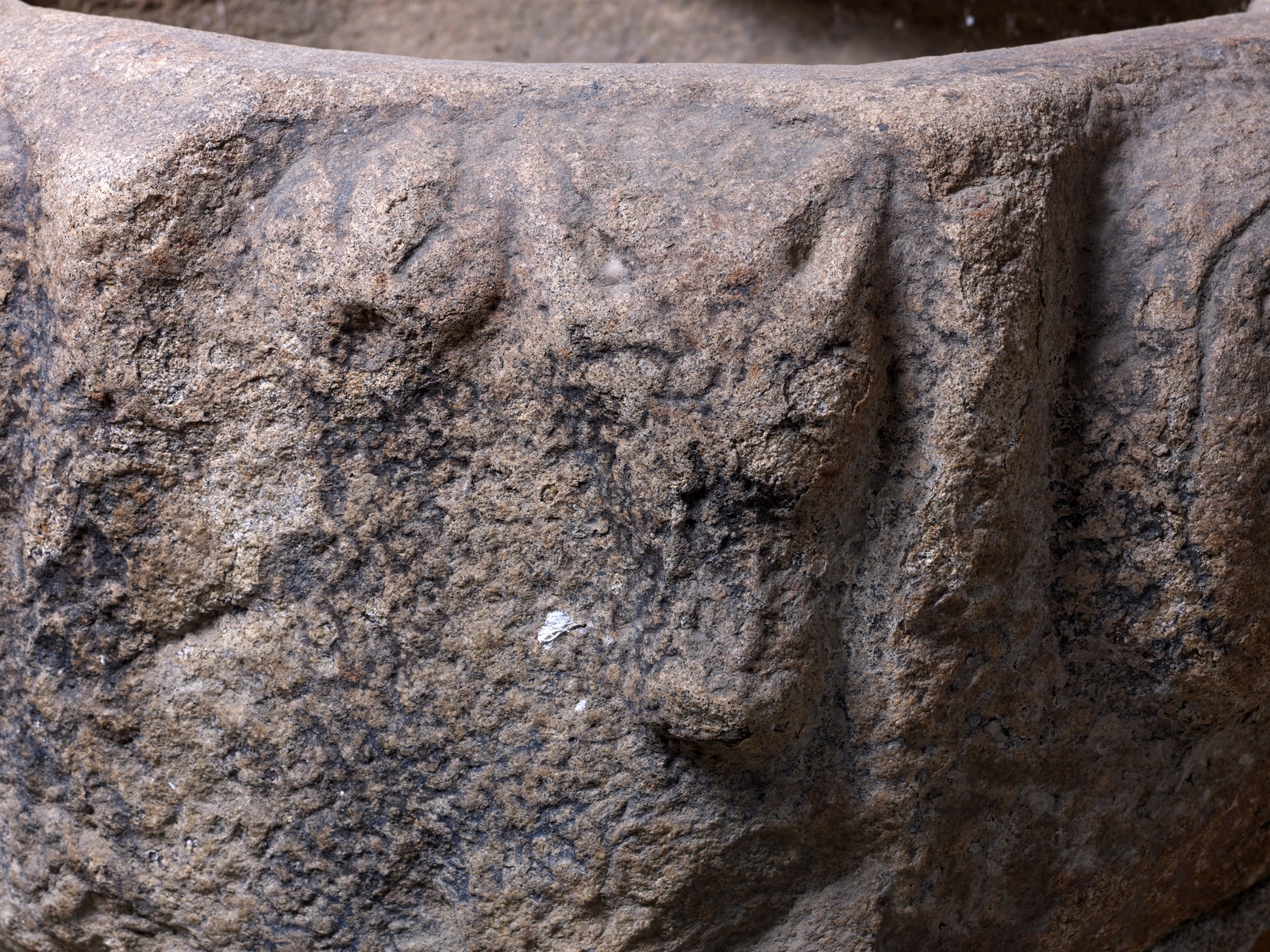 Porche sud. Bénitier, 14e siècle. Détail d'une tête sculptée de loupImmatriculation
