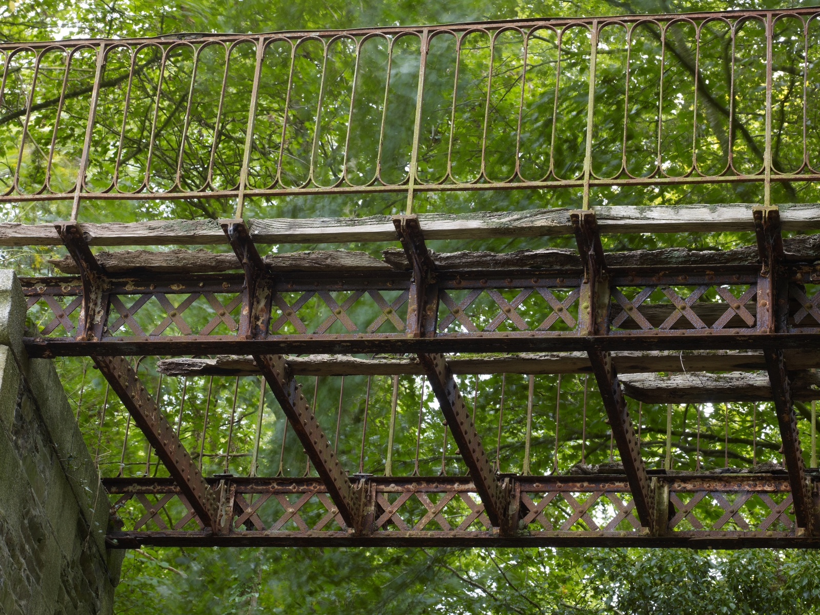 Passerelle métallique. Tablier vu du dessous : poutrelles rivetées fixées sur les poutres en treillisImmatriculation