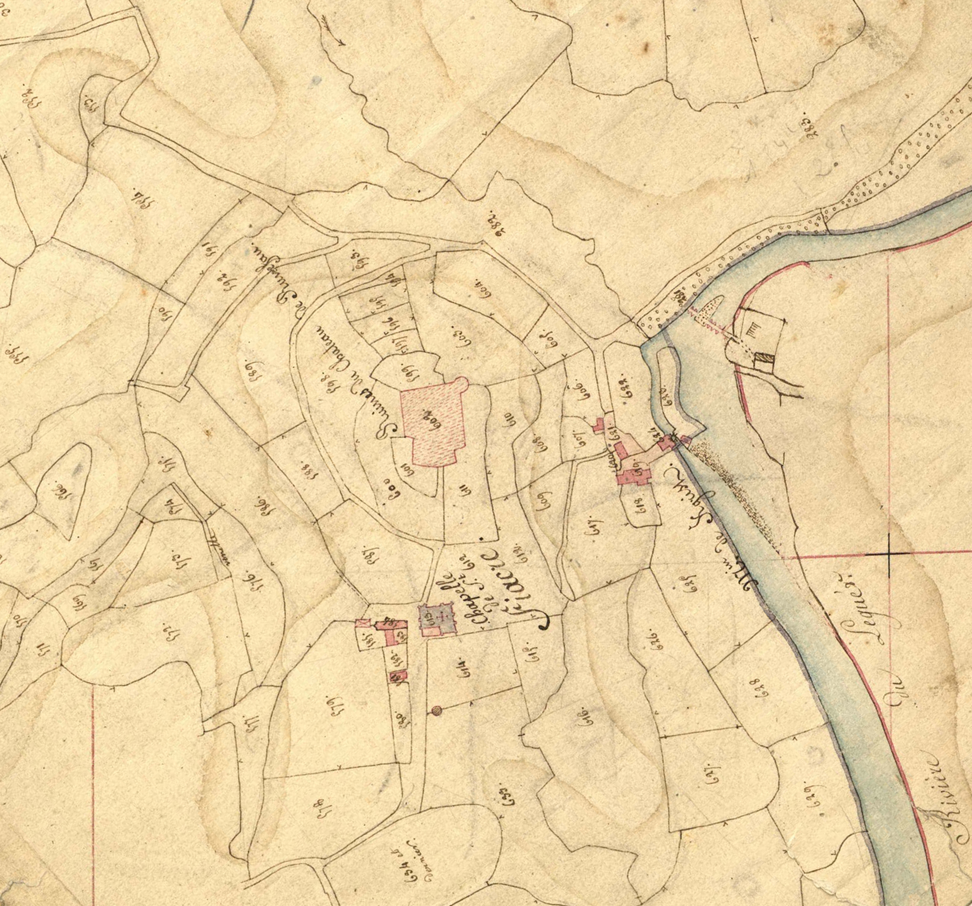 Extrait du cadastre parcellaire de la commune de Ploubezre, 1826 : château fort de Runfao sur la rive ouest du LéguerImmatriculation