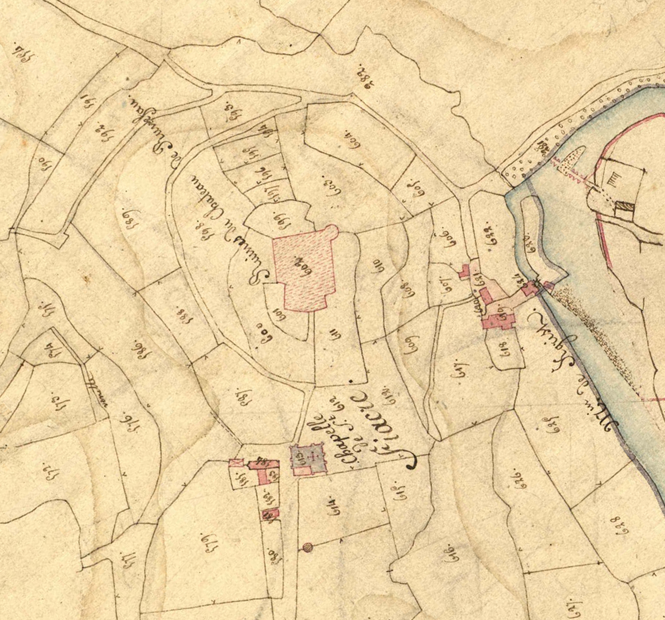 Extrait du cadastre parcellaire de la commune de Ploubezre, 1826 : château fort de Runfao sur la rive ouest du LéguerImmatriculation