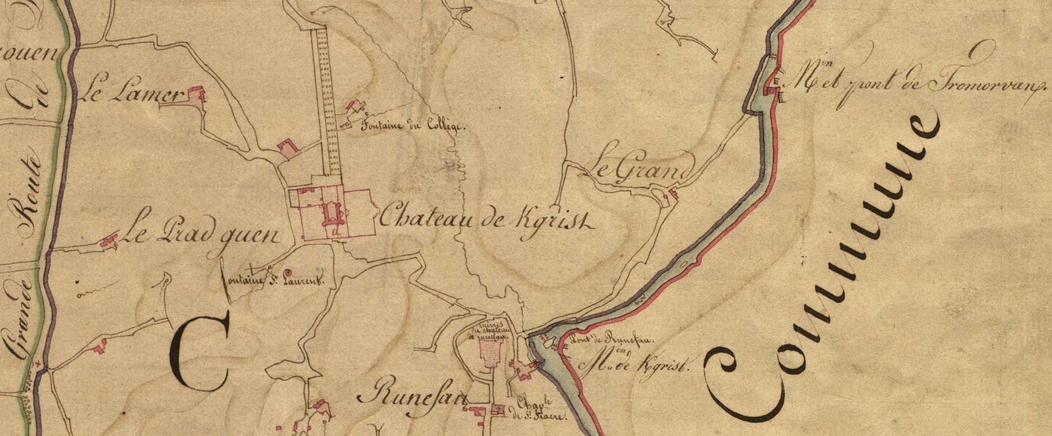 Extrait du tableau d'assemblage du cadastre parcellaire de la commune de Ploubezre, 1826 : environs du château de Kergrist. Au sud-est, le château de Runfau [Runfao]Immatriculation