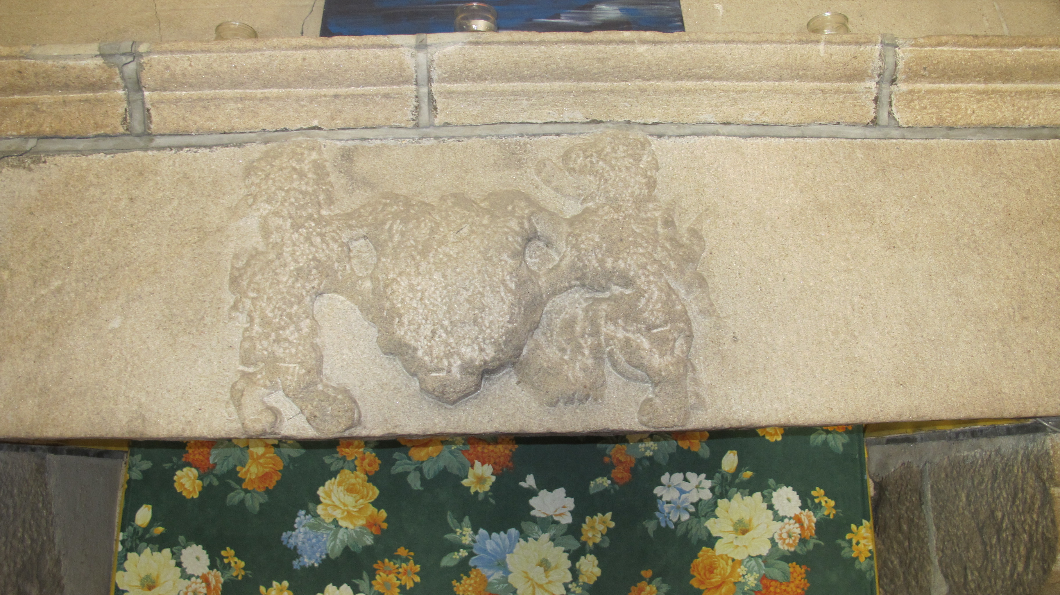 Cheminée, détail du linteau, blason présenté par deux lions issantImmatriculation