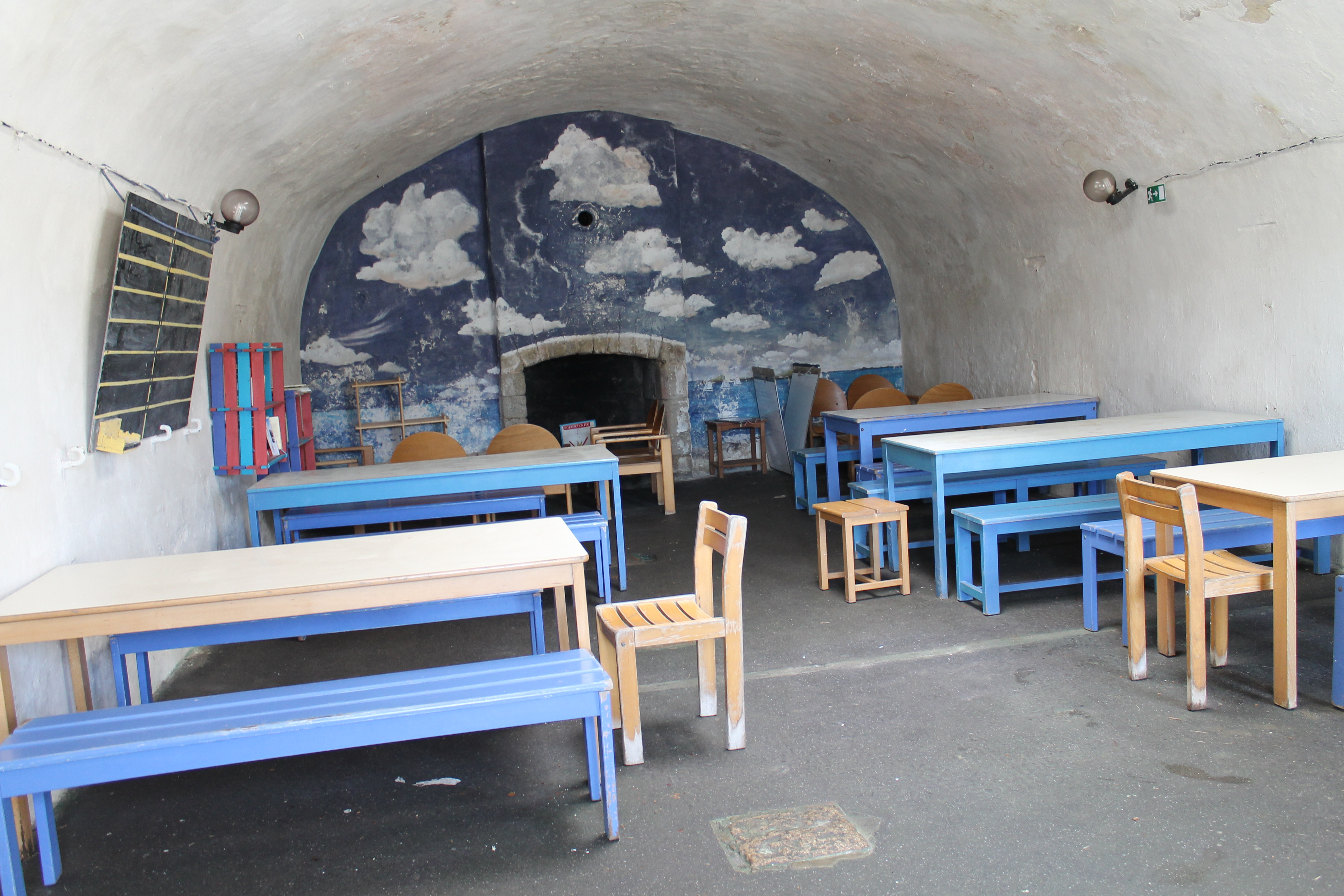 Vue intérieure d'une casemate réaménagée en cuisine pour l'école de voile des GlénansImmatriculation