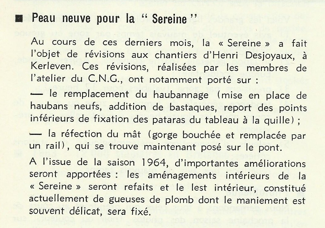 Peau neuve pour la Sereine au chantier H. Desjoyaux- Glénans N° 38-1964, p. 33Immatriculation