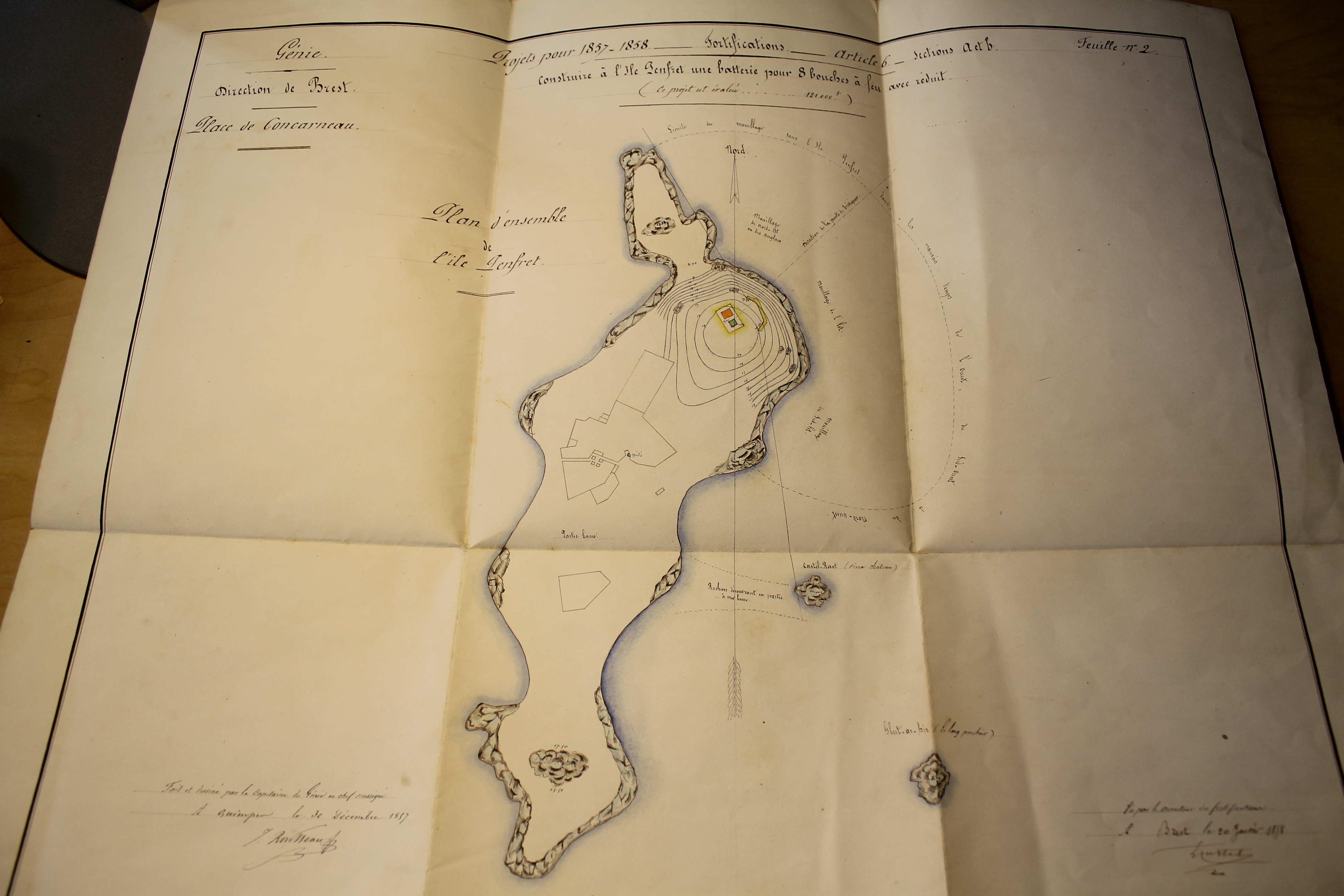 Construire à l'île Penfret une batterie pour 8 bouches à feu avec réduit, signé par le capitaine du génie en chef, Rousseau, le 30 décembre 1857Immatriculation