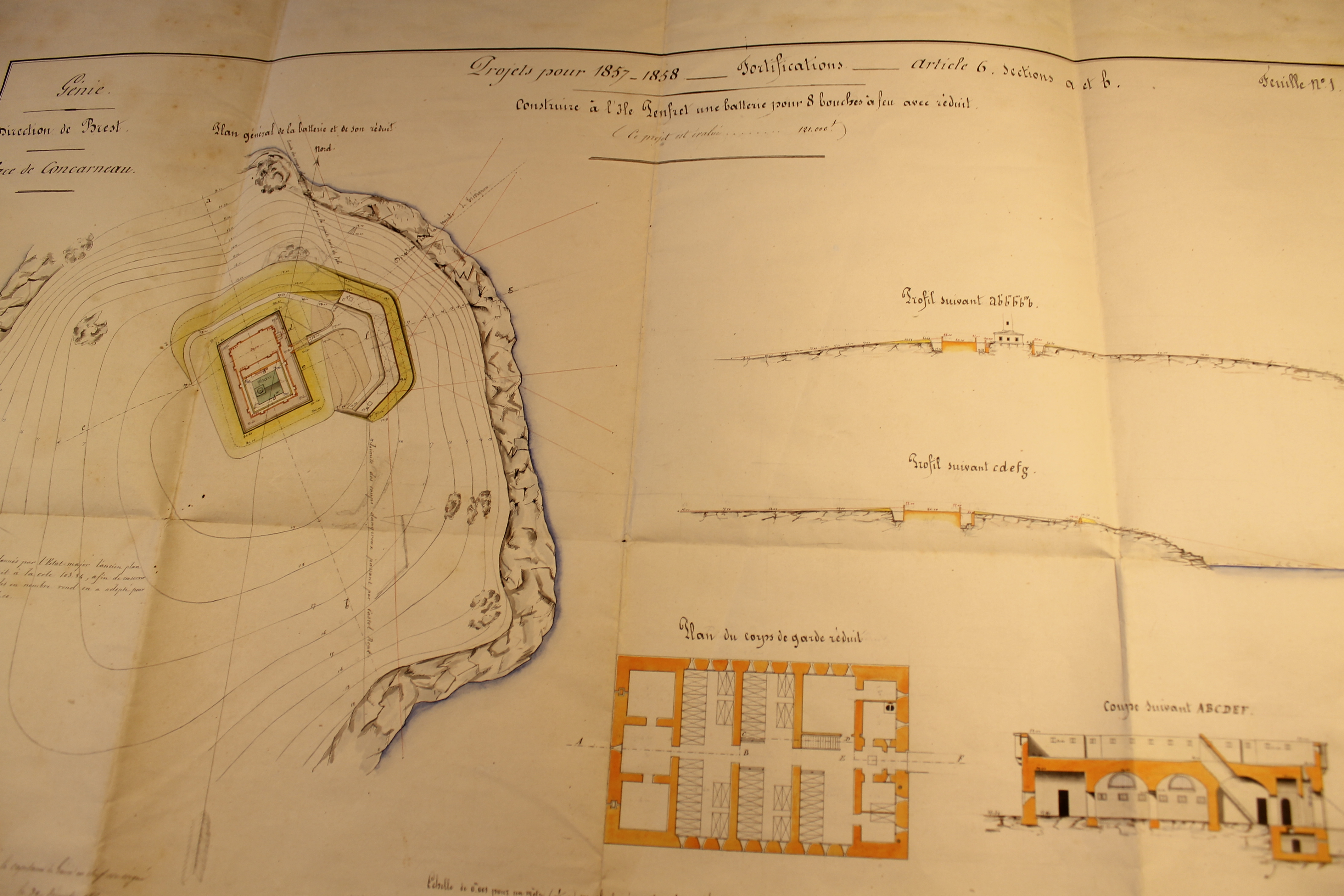 Construire à l'île Penfret une batterie pour 8 bouches à feu avec réduit, signé par le capitaine du génie en chef, Rousseau, le 30 décembre 1857, contresigné parle directeur des fortifications, Brest le 20 janvier 1858