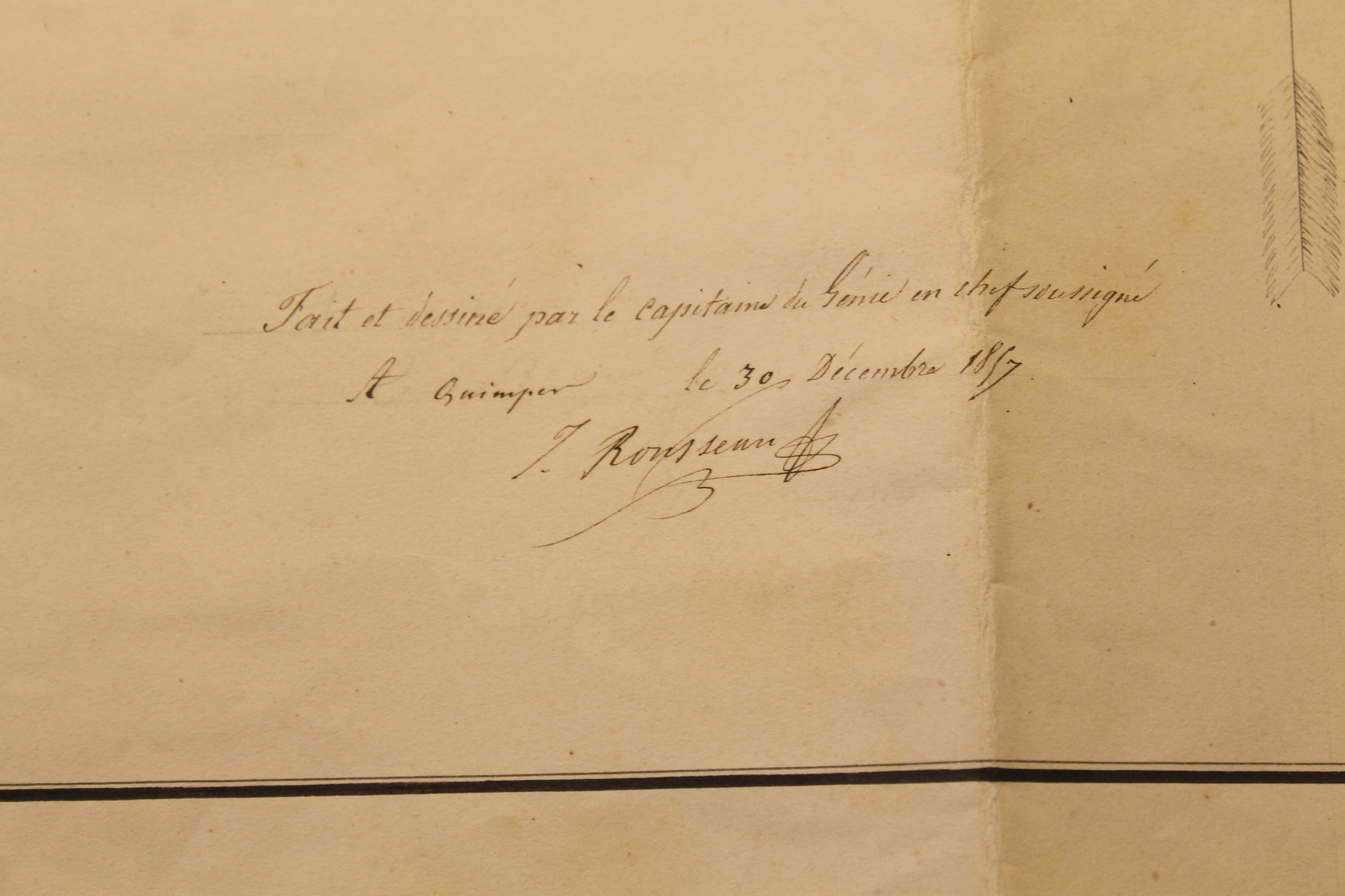 Construire à l'île Penfret une batterie pour 8 bouches à feu avec réduit, signé par le capitaine du génie en chef, Rousseau, le 30 décembre 1857, contresigné parle directeur des fortifications, Brest le 20 janvier 1858