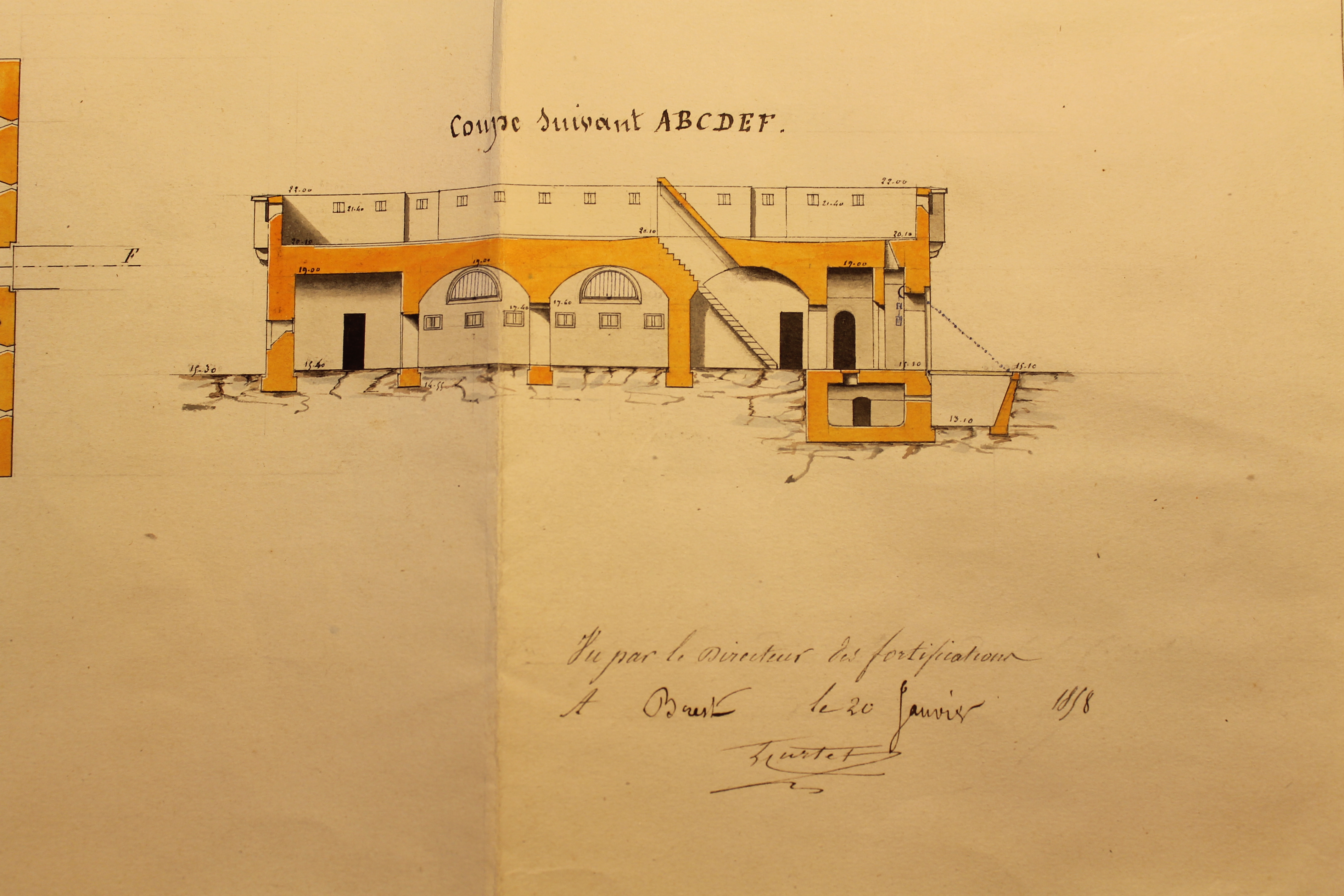 Construire à l'île Penfret une batterie pour 8 bouches à feu avec réduit, signé par le capitaine du génie en chef, Rousseau, le 30 décembre 1857, contresigné parle directeur des fortifications, Brest le 20 janvier 1858