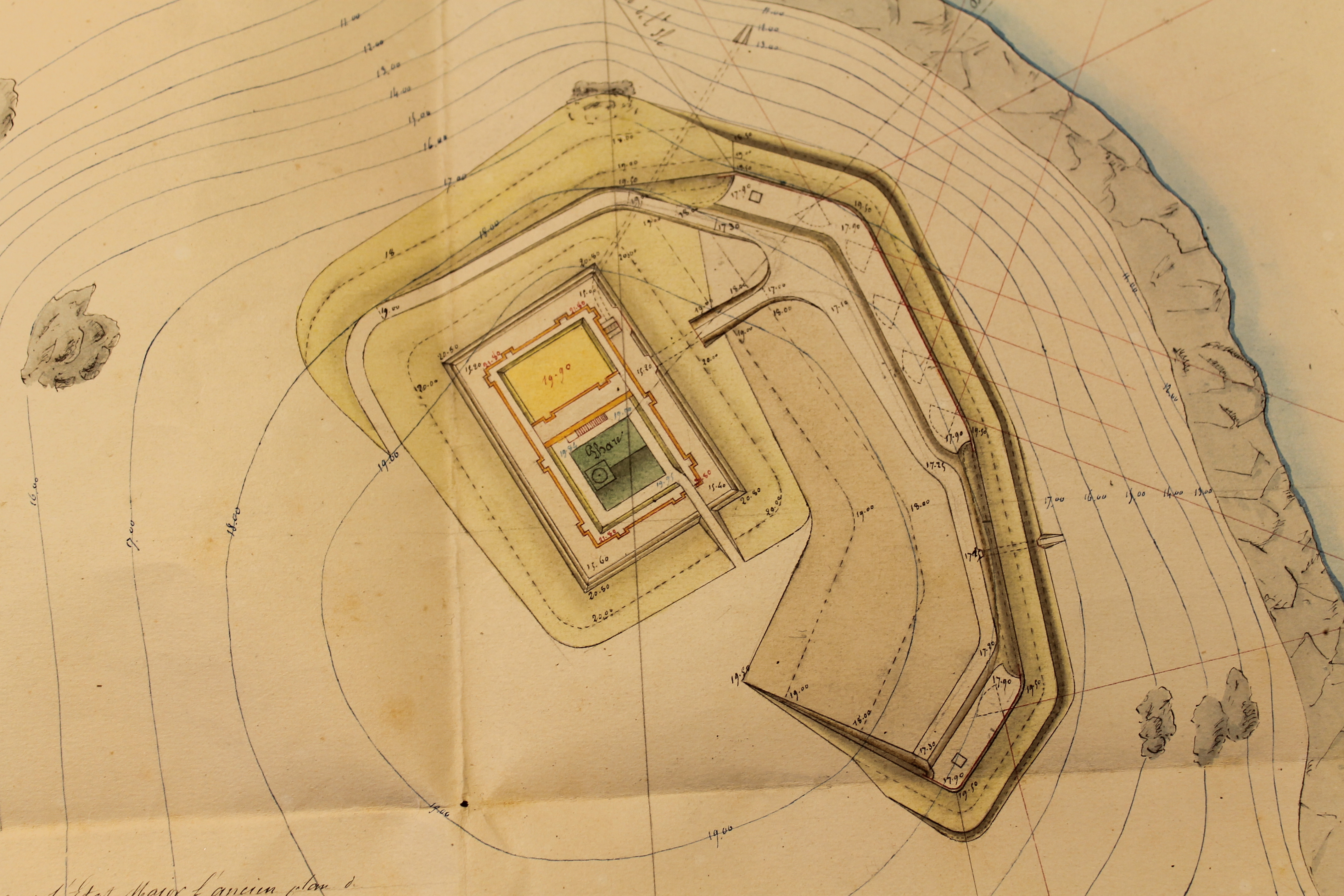 Construire à l'île Penfret une batterie pour 8 bouches à feu avec réduit, fait et dessiné par le capitaine du Génie en chef, Rousseau, à Concarneau, le 4 juin 1858