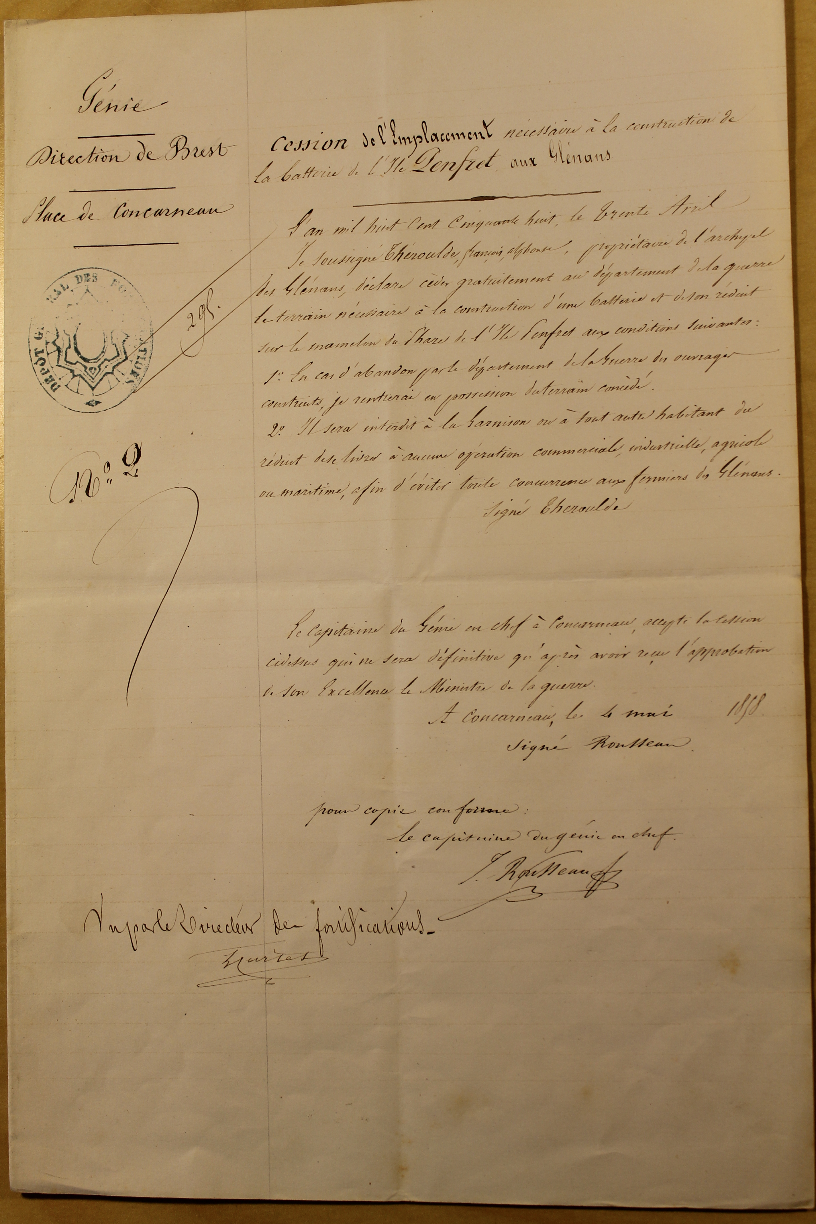 Cession de l'emplacement nécessaire à la construction de la batterie de l'île Penfret aux Glénans, le 30 avril 1858