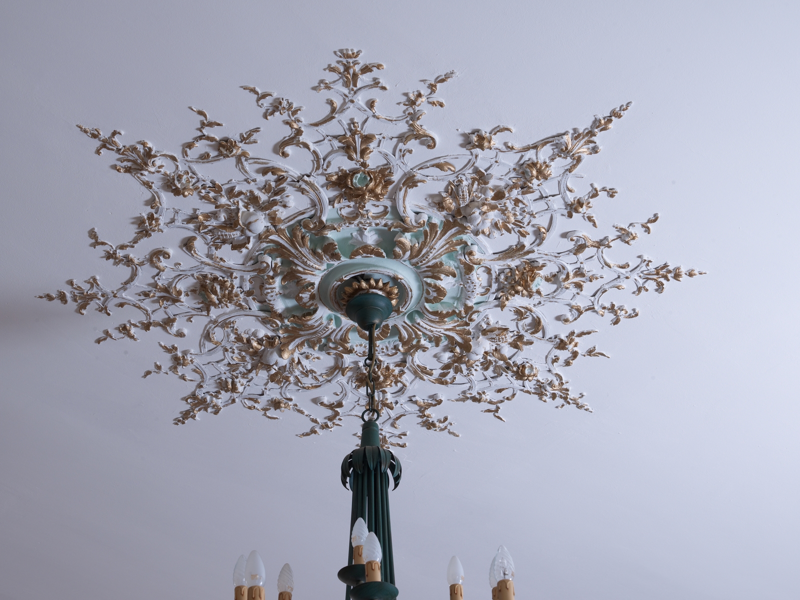 Rez-de-chaussée. Pièce à droite du hall d'entrée dite "salle Saint-Yves". Détail de la rosace du plafondImmatriculation