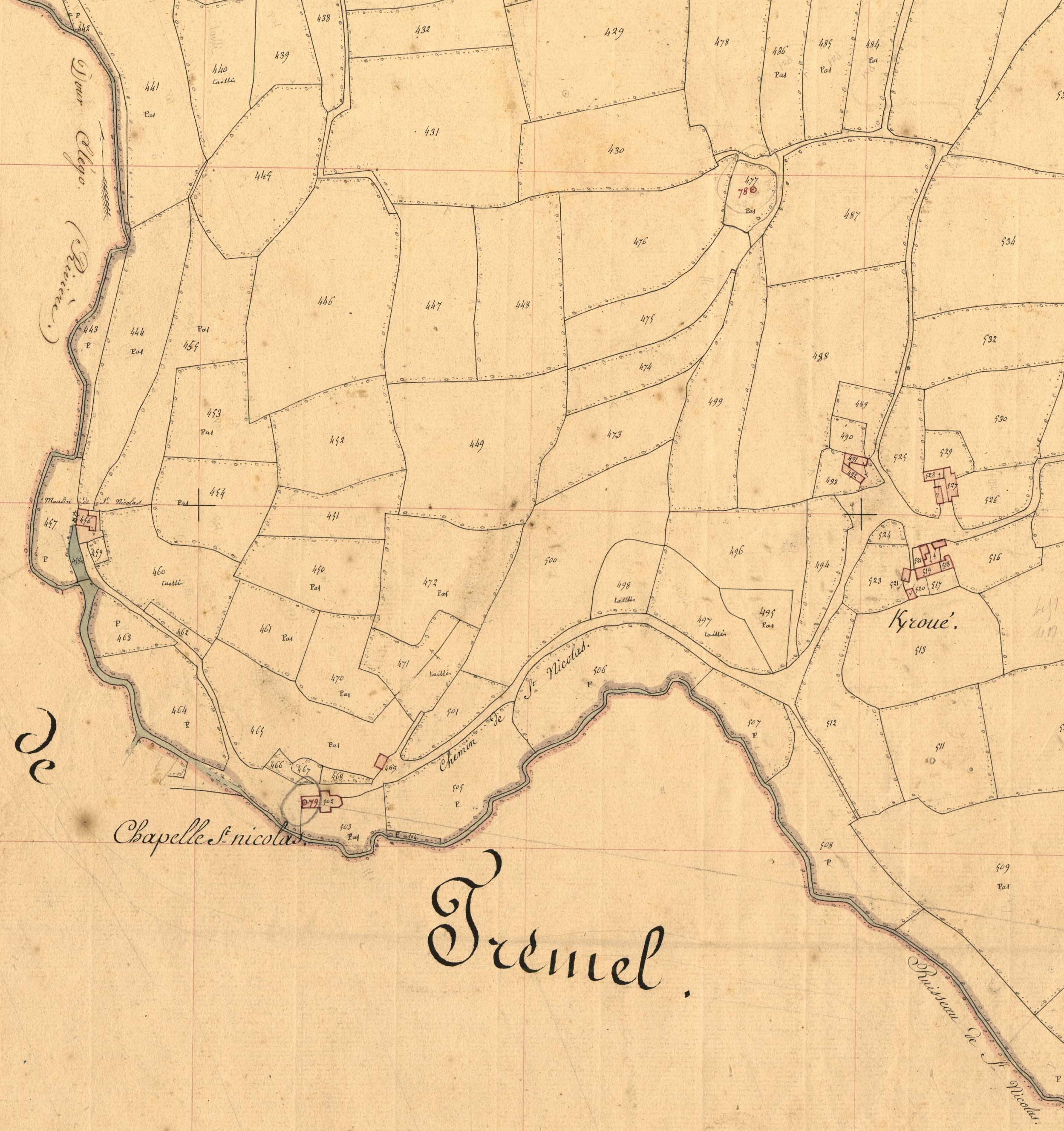 Extrait du cadastre ancien de la commune de Plufur, 1848 : chapelle Saint-Nicolas et moulin, K[er]rouéImmatriculation