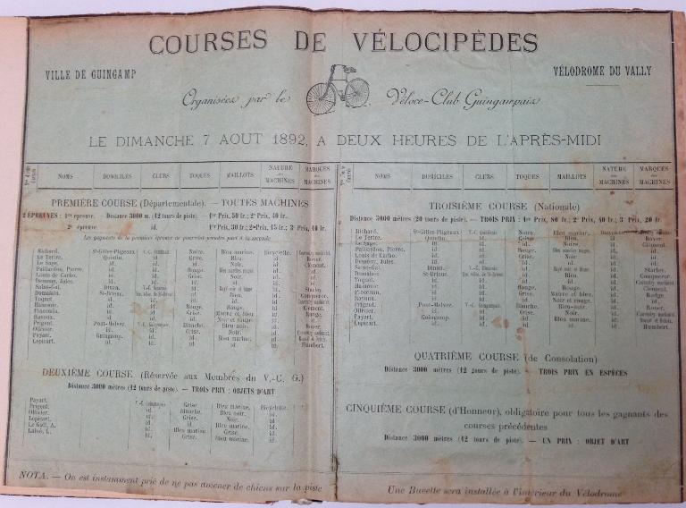 Programme des courses de vélocipèdes organisées par le Véloce-Club Guingampais au vélodrome du Vally pour le dimanche 7 août 1892Immatriculation
