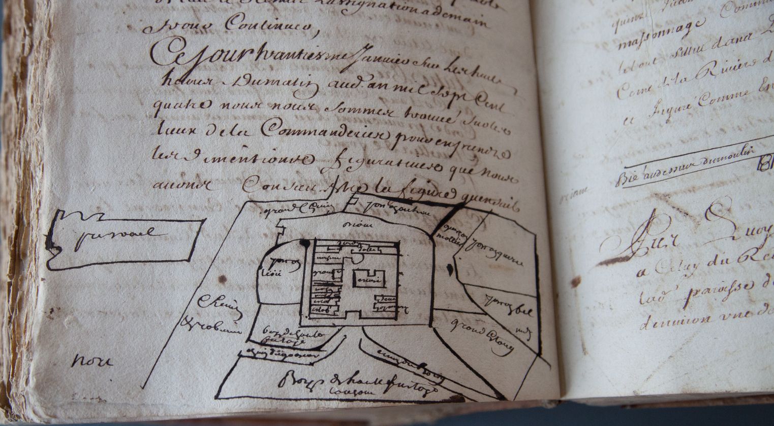 Croquis du manoir commandal de Pont-Melvez, Terrier de la commanderie de La Feuillée, 1705 (A. D. de La Vienne, 3H1 444Immatriculation
