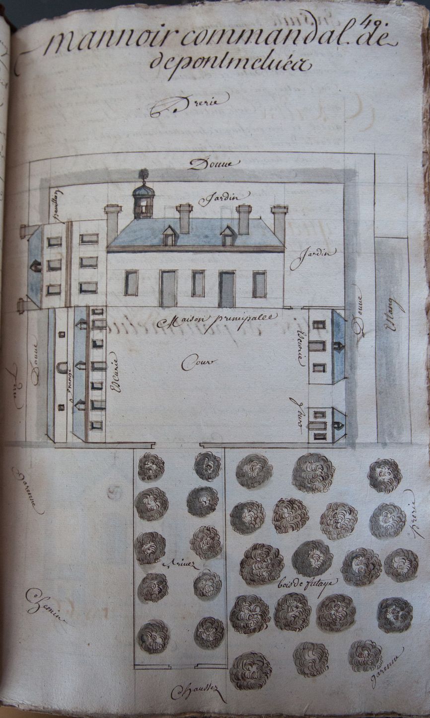 Manoir commandal de Pont-Melvez, Dessin à la plume aquarellé, 1731 (A. D. de La Vienne, 3H1 446)Immatriculation