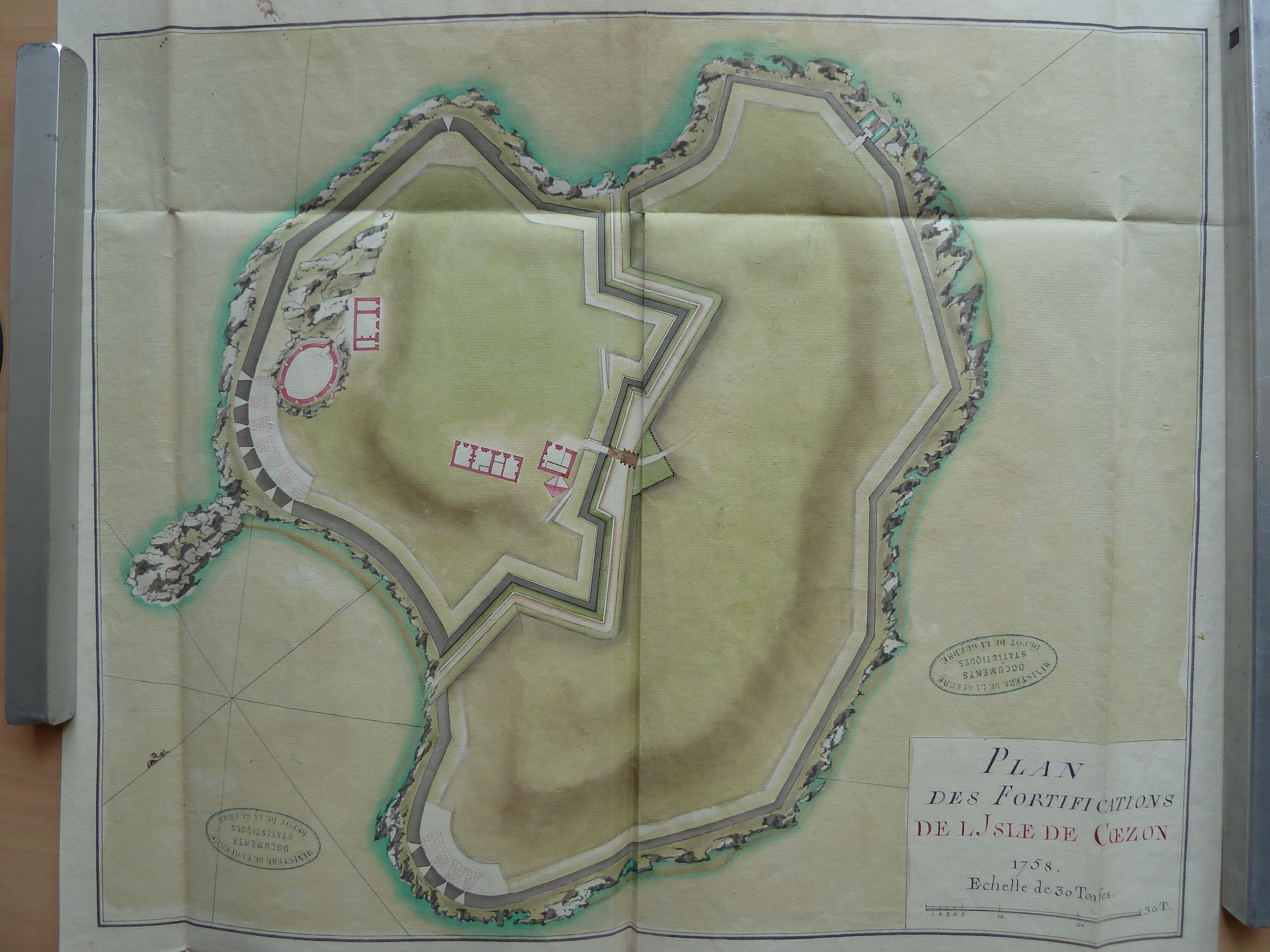 Plan des fortifications de l'île Cézon, 1758, Service historique de la défense, Fonds de l'armée de Terre, série M : Archives du dépôt de la Guerre, 1 M : mémoires et reconnaissances, 1089 (reproduction : Patrick Jadé)Immatriculation