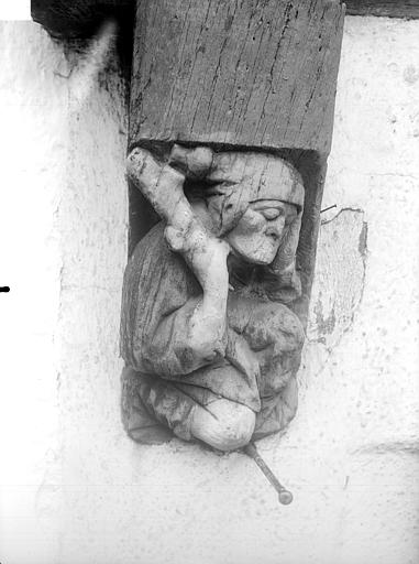 Malestroit. Maison de la truie qui file. Façade au rez-de-chaussée, console sculptée : homme endormi au bâton. Photographie, par Gueranne, avant 1919.
