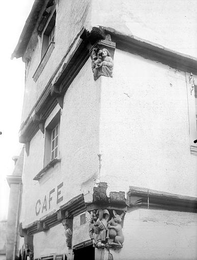 Malestroit. Maison de la truie qui file. Angle de la façade : 1er étage. Photographie, par Gueranne, avant 1919.