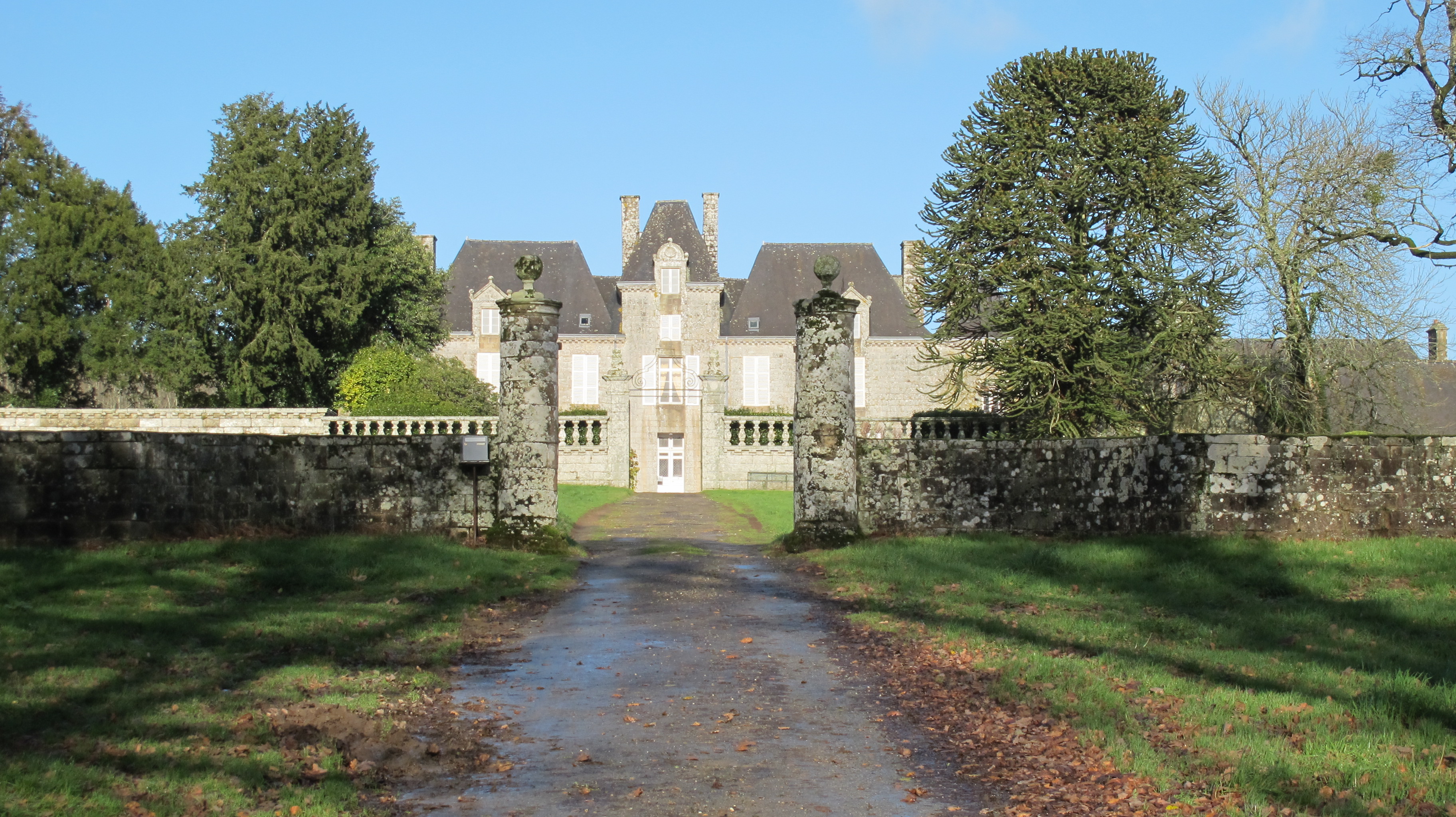 Vue de situation sud : piliers d'entrée de la première cour, clôture de la 2e cour, élévation antérieure du logis, état en 2015Immatriculation