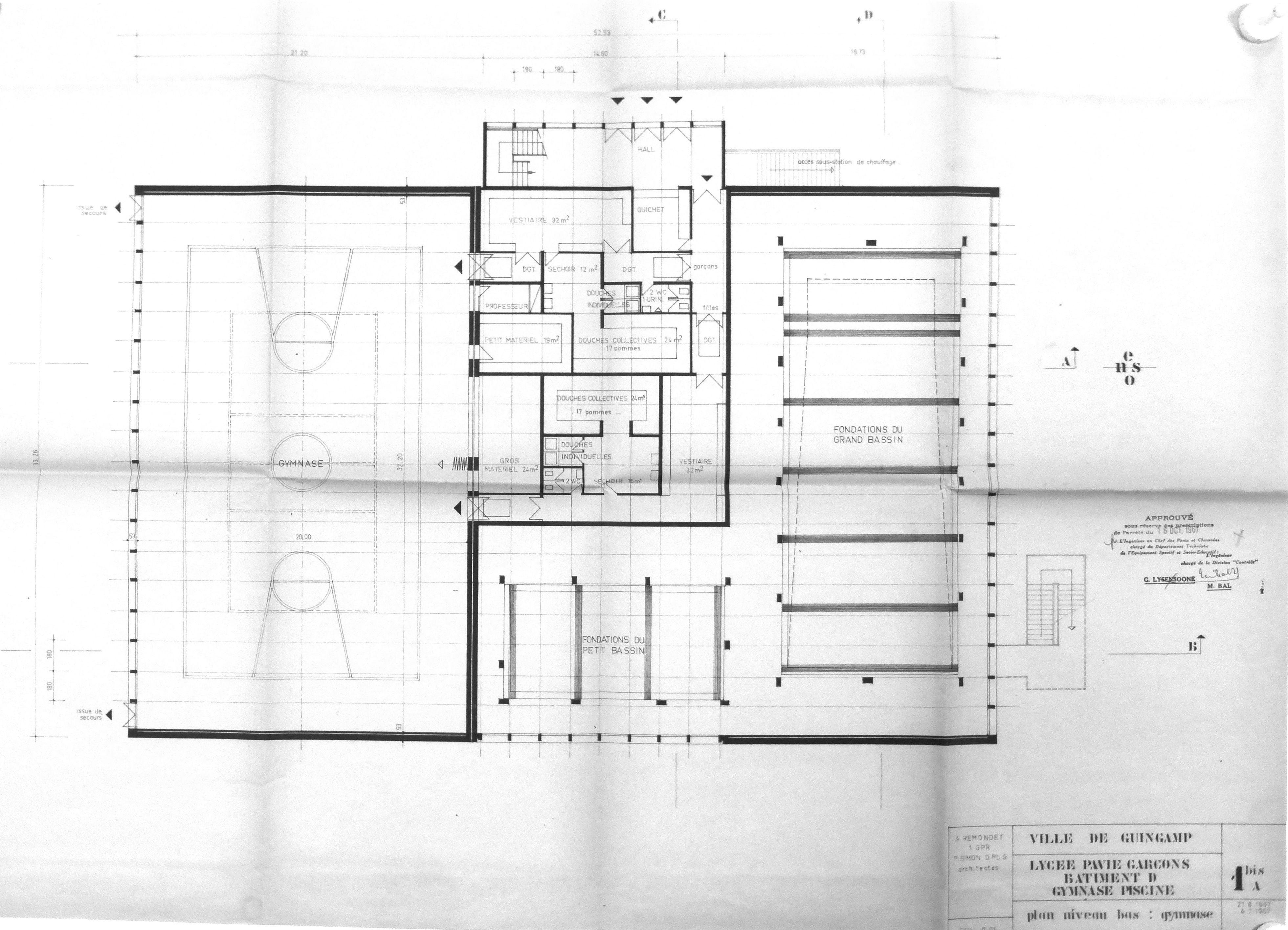 AN : 19790547/37. Plan du gymnase-piscine (niveau bas). A. Remondet, 1967.